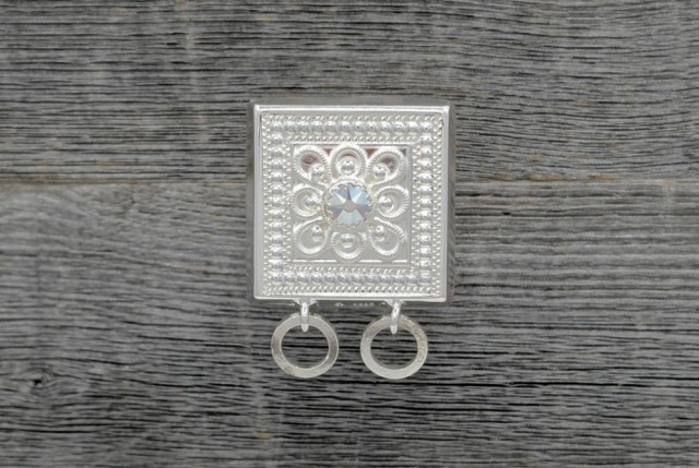 Støler/firkantete knapper med filigran detaljer i midten.