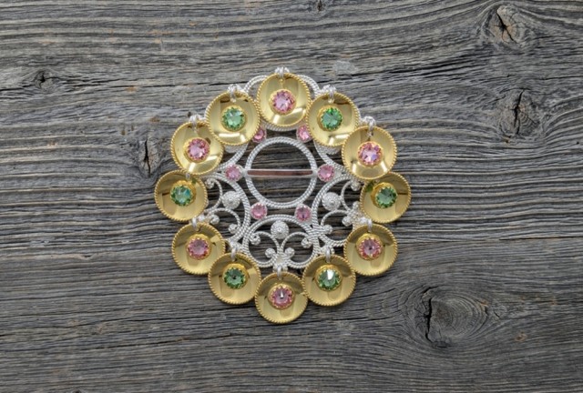 Sølje 61612 PrisNOK3 210,00 inkl. mva. Kjøp Del dette Produktinfo Sølje med forgylte løv og sten. Diameter: 60mm Avbildet med peridot og light rose stenfarge på løvene og light rose stenfarge på sølja.